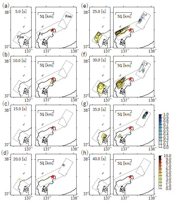 低い周波数の解析では、地震の破壊は主に西方向へ広がり、震源付近と能登半島北西部で強い揺れを生み出したことが分かりました。一方、能登半島北東沖の断層では大きな地震波の励起は見られませんでしたが、やや弱い励起域が北東方向へ広がっており、今回の地震は「非対称な両側破壊」であったことを示しています。これは、地殻変動や津波のデータから推定された「すべりの大きな場所(アスペリティ)」の分布とも一致しています。