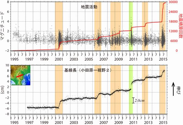 温泉地学研究所でGPSのデータに注目している理由は様々ありますが、箱根火山に関しては、主としてこのようなマグマだまりの膨らみを見ているかも知れないという前提で、様々な角度から検討をしています。2015年の噴火前にも、マグマだまりの膨らみが観測されました(図2-2)。しかし、こうした観測データが得られるのは珍しいことではありません。マグマだまりの膨張現象は数年に1回程度の割合で発生しています。また、マグマだまりの膨張が起きると地震活動が活発化することも知られています(図2-3)。